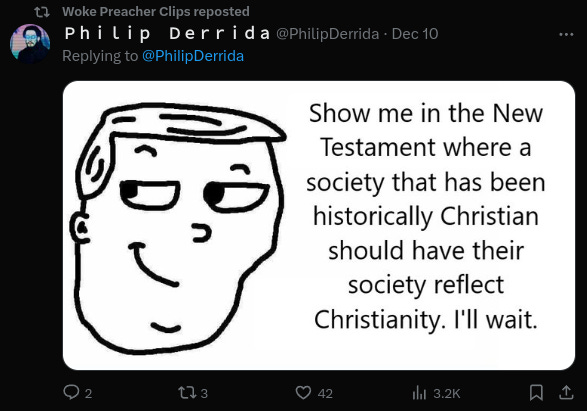Many in the discernment ministry space are even friendly with this element; Woke Preacher Clips is very friendly with anonymous, volkish Christian Nationalists, such as Philip Derrida, and often promotes anti-leftist posts from Christian Nationalists.