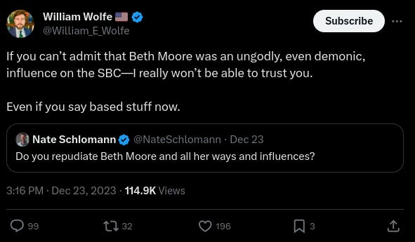 On December 23, the perpetually attention-seeking Christian Nationalist, William Wolfe, stoked the ire of moderate and liberal Christian X (formerly known as Christian Twitter), when he posted, “If you can’t admit that Beth Moore was an ungodly, even demonic, influence on the SBC—I really won’t be able to trust you. Even if you say based stuff now.”