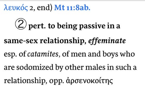 Most notably, Ascol cut off his screenshot right before the second meaning of μαλακοὶ, as it is used the only time it appears in Scripture in that declension, and the only time it describes people and not “soft clothing.”