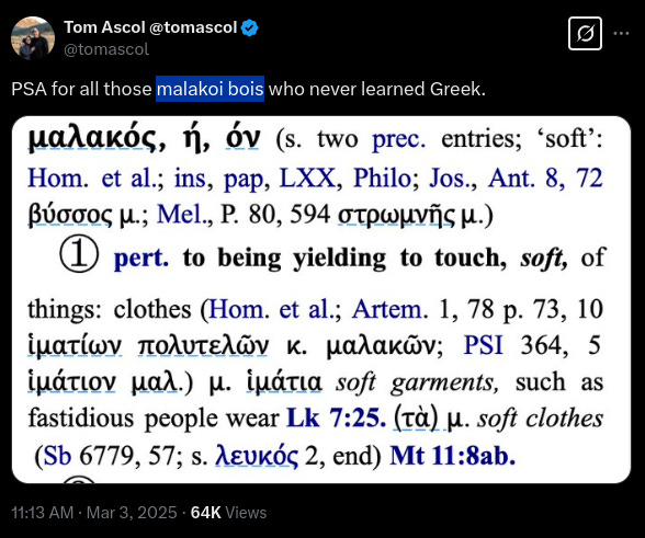 Firstly, Ascol claimed that he wasn’t calling Mike Cosper, Director of Media for Christianity Today, the equivalent of a slur that starts with the letter F, but that μαλακοὶ generally means an effeminate man (as if that’s any better). In his defense, he posted a screenshot of Bauer’s Lexicon, while continuing to revile his critics using immature internet lingo.