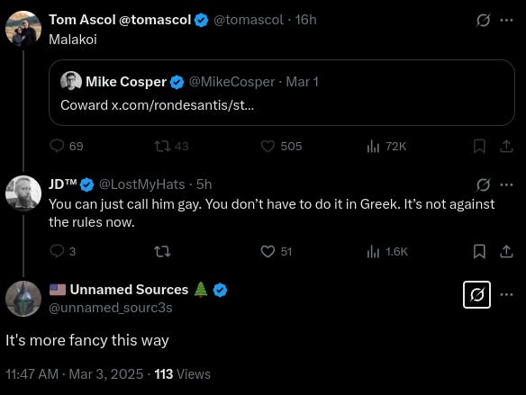 Ascol continued his reviling behavior throughout the day, often jumping in to agree with his allies and fans who derided those criticizing him. Then Associate Reformed Presbyterian Church pastor Matt Carr, who had publicly rebuked Ascol, revealed that Ascol had responded by antagonistically adding him to a list called “Malakoi bois.” This is a common tactic of the most debased anonymous accounts on X, because it doesn’t show up publicly, but appears in the target’s notifications.