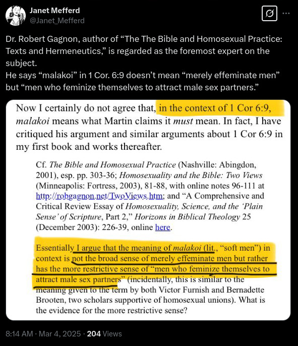 It’s also of note that μαλακοὶ is the nominative plural form of the root word μαλακός, meaning that Ascol, by his own reasoning, technically called Cosper “effeminate men,” which adds a layer of irony to his claim that others never learned Greek. It also is another piece of circumstantial evidence that he haphazardly lifted the word from 1 Corinthians 6:9, again, the only place it appears in that declension, and in which it carries that very specific, cultural meaning. To make matters worse for Ascol, the most studied Greek scholars disagree with his interpretation of the word, as journalist Janet Mefferd showed in an extensive thread on X.